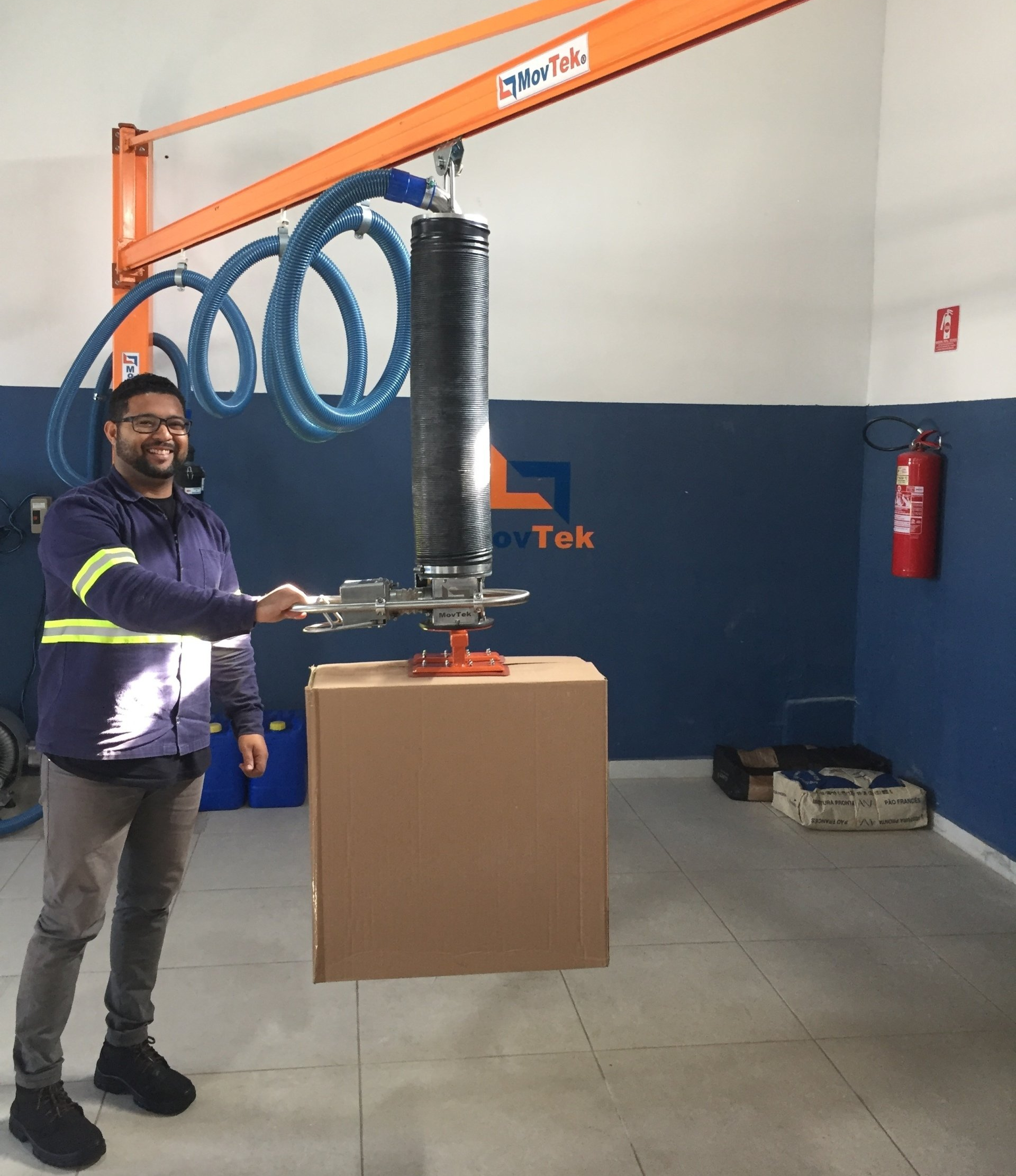 Terminal de sucção com duas ventosas retangulares para caixas, com estrutura de sustentação tipo grua giratória.